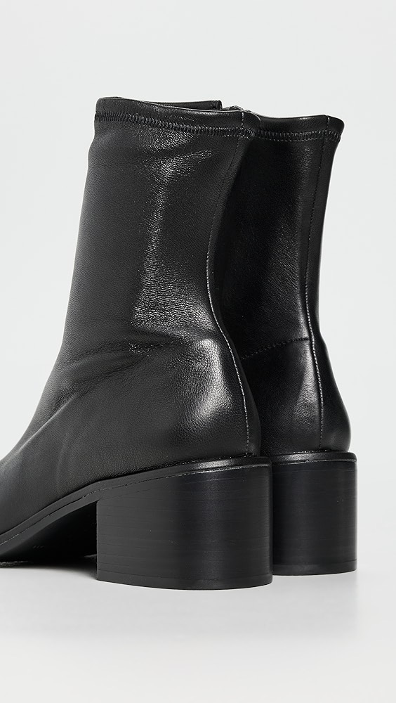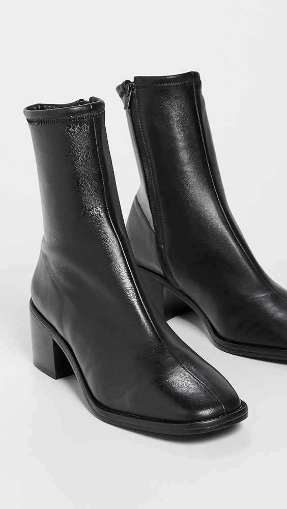 Upper: Cowhide Stretch suede Lining: Leather Chunky heel Zip closure Pointed toe Leather sole with rubber patch Imported, China This item cannot be gift-boxed Style #LOEFF40795 Making it easy to nail those dress-up, dress-down looks, these Loeffler Randall booties balance formfitting, stretch suede with a chunky heel for a boot…