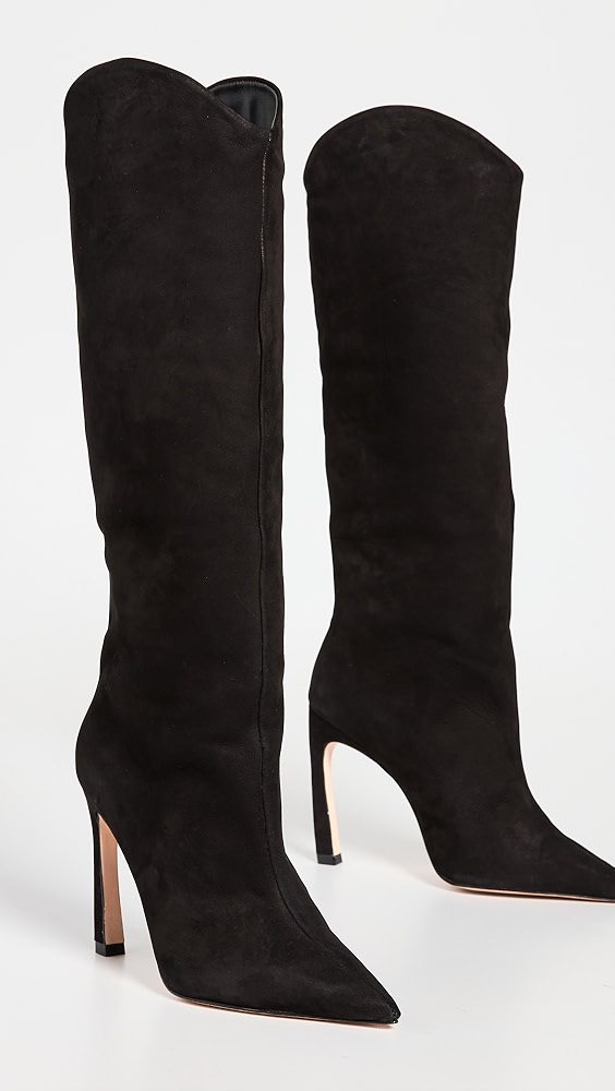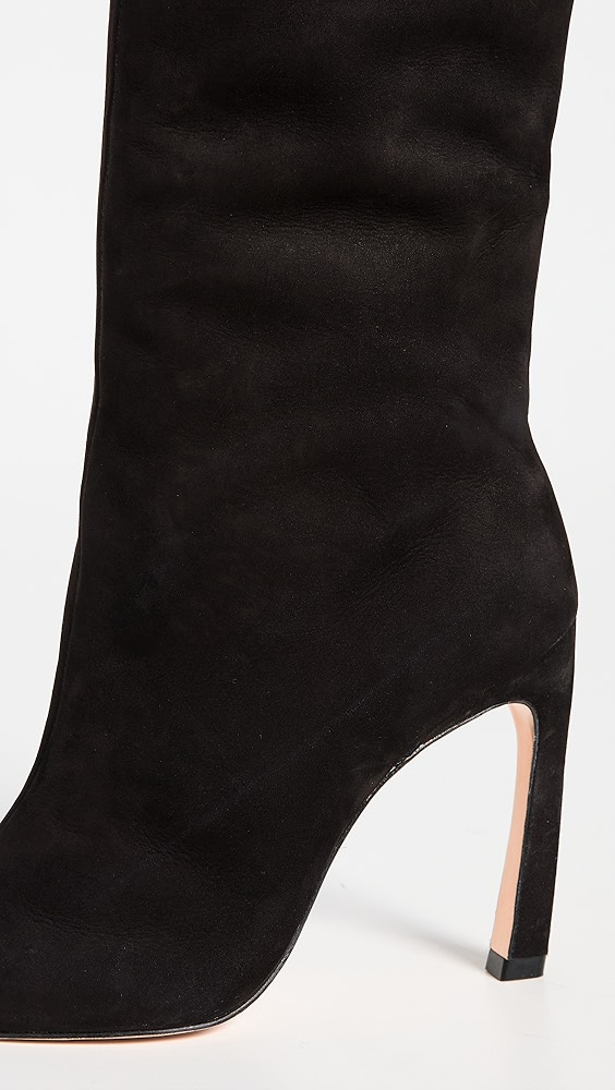 These sleek Schutz boots feature a tall silhouette in dark suede for a polished silhouette. Pair them with knee length dresses or tuck in a pair of skinny pants to create a streamlined look.