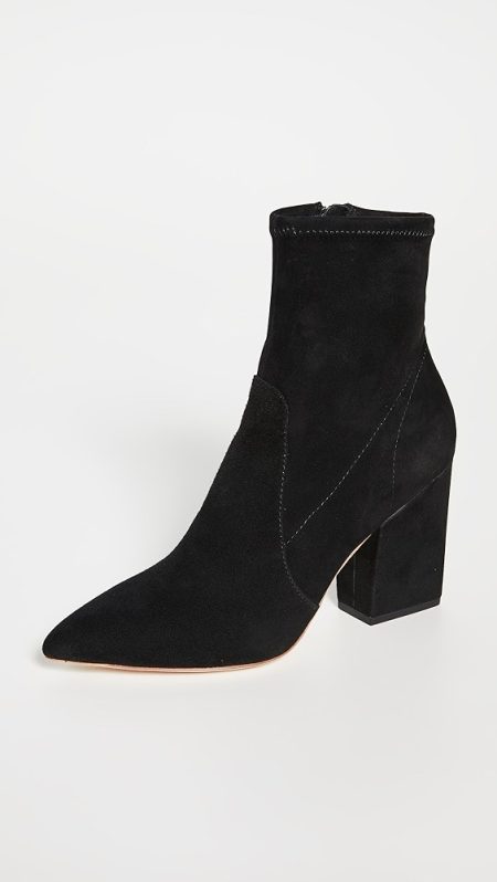 Upper: Cowhide Stretch suede Lining: Leather Chunky heel Zip closure Pointed toe Leather sole with rubber patch Imported, China This item cannot be gift-boxed Style #LOEFF40795 Making it easy to nail those dress-up, dress-down looks, these Loeffler Randall booties balance formfitting, stretch suede with a chunky heel for a boot…