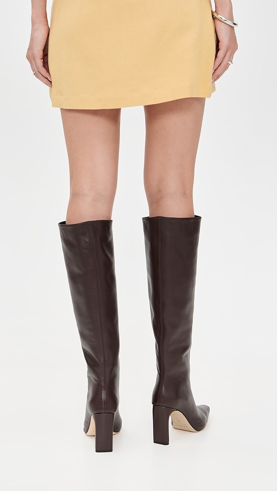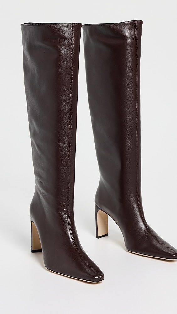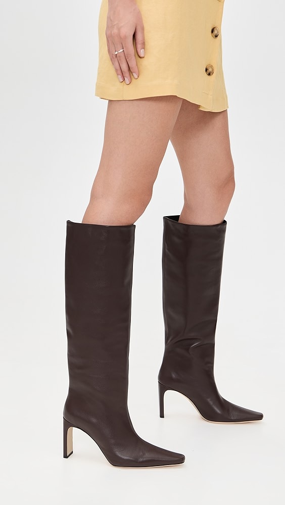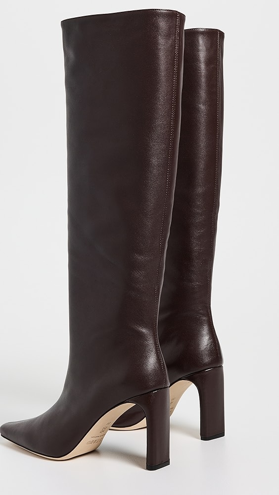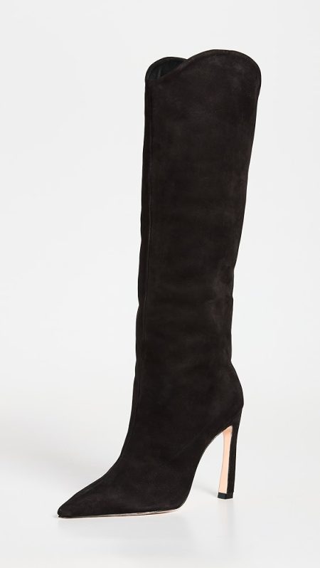 Leather: Calfskin suede Stiletto heel No closure, pull-on design Pointed toe Leather sole with rubber heel cap Leather lining Imported, Brazil This item cannot be gift-boxed Style #SCHUT31291 These sleek Schutz boots feature a tall silhouette in dark suede for a polished silhouette. Pair them with knee length dresses or…